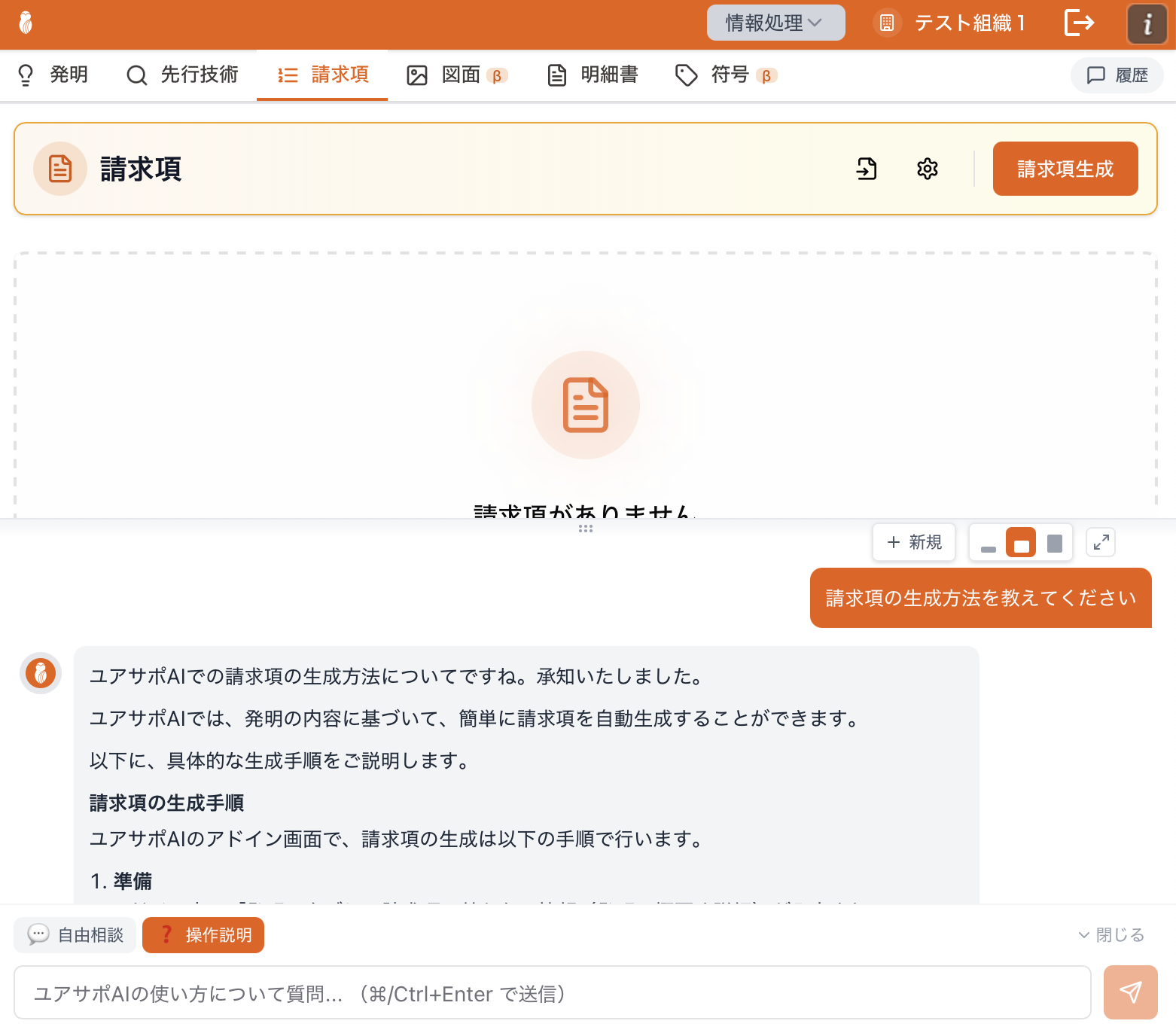 「発明タブ」「請求項」「明細書」「図面」など、具体的な機能名を含めると、より正確な回答が得られます。ドキュメントとの連携