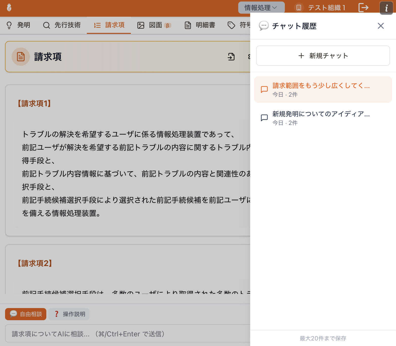 画面右上の「履歴」ボタンをクリックすると、チャット履歴パネルが開きます。