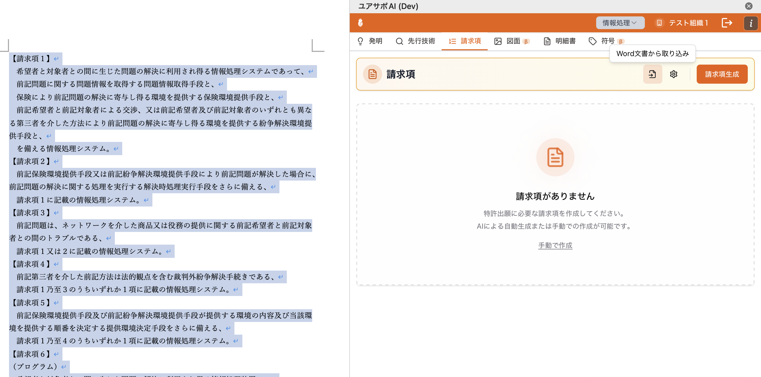 選択範囲がない場合は、文書全体から請求項を検索して取り込みます。