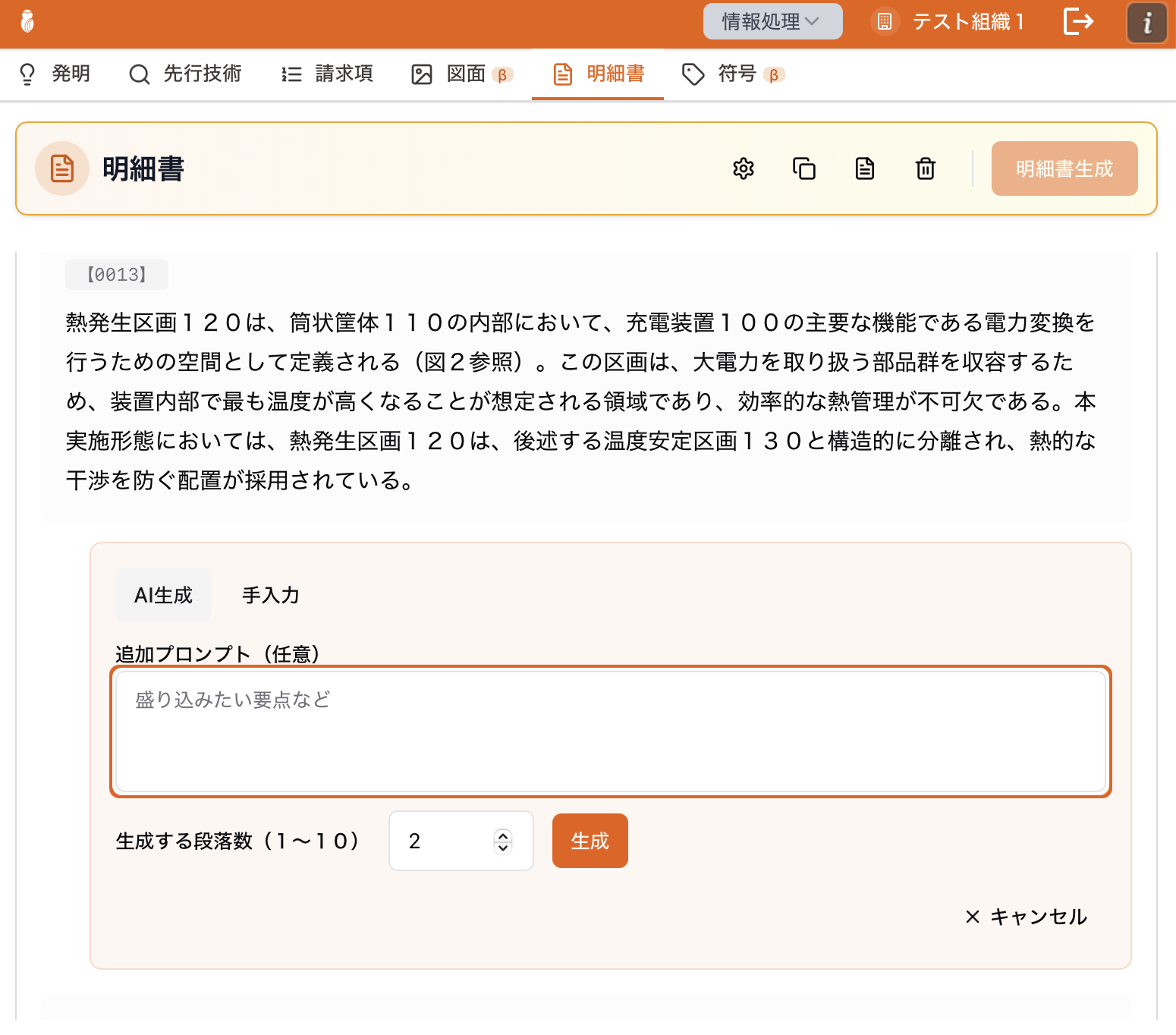 「発明を実施するための形態」セクションでは、段落単位での編集・生成が可能です。