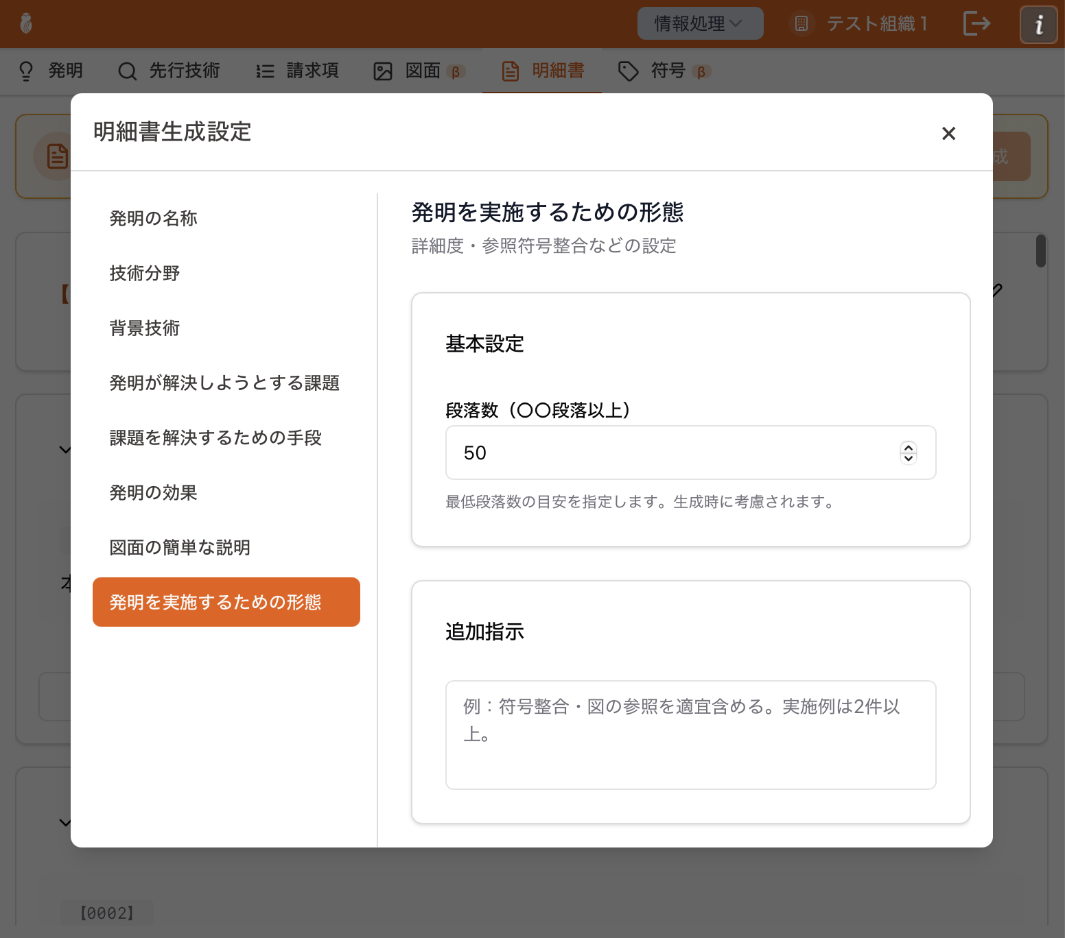 - 追加指示: 技術分野の書式・詳細度に関する追加指示