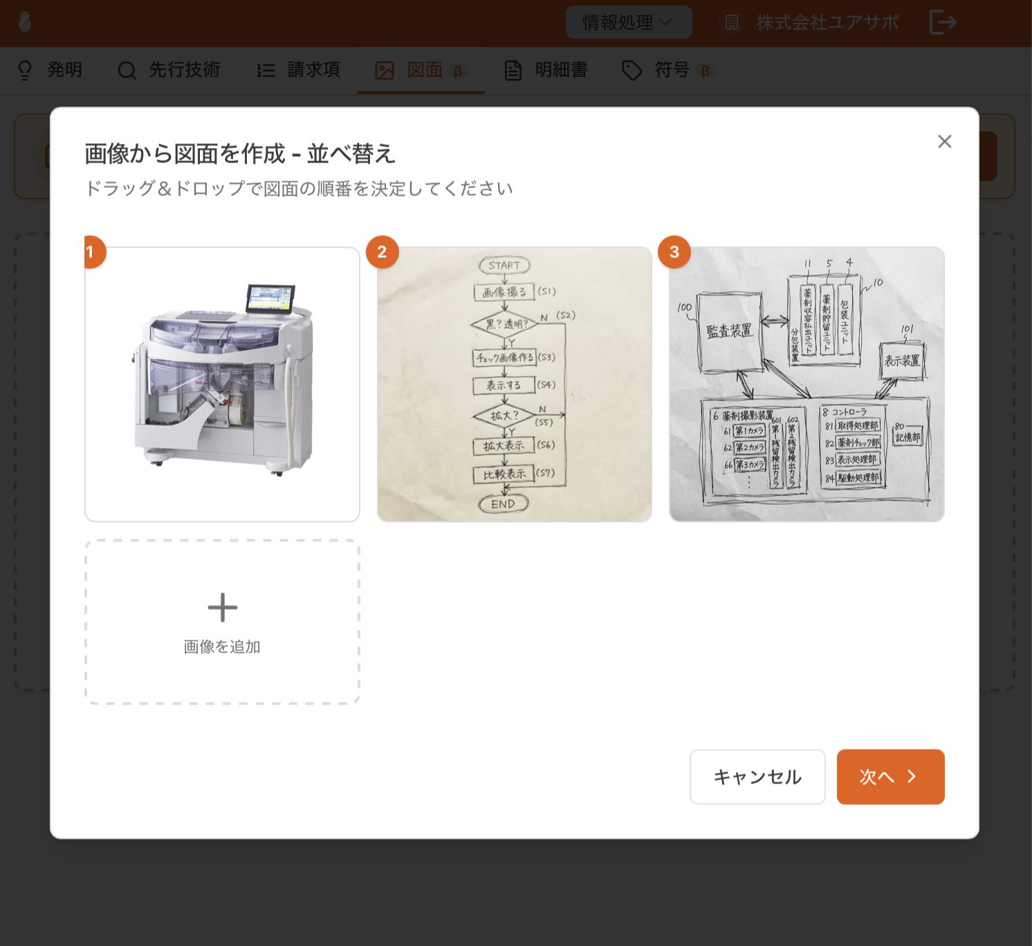 実験装置や製品の写真をインポートし、特許図面スタイルに変換。構成要素に自動で符号を付与します。注意事項