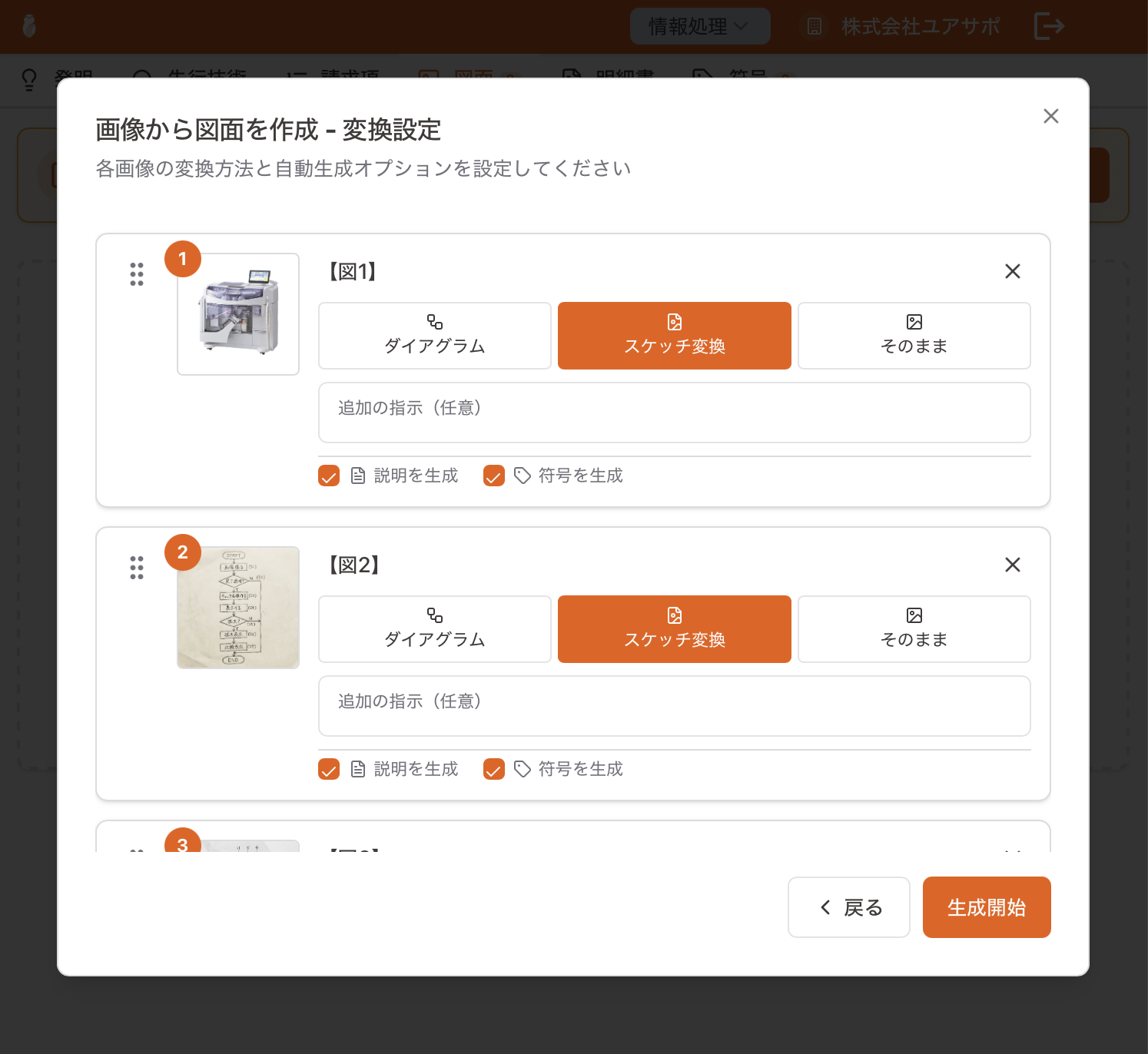 画像インポート機能を使用すると、手元の画像ファイル(写真、手書きスケッチ、既存の図面など)を複数選択して、一括で図面を作成できます。各画像に対して変換方法を指定し、図面の説明と符号を自動生成することも可能です。画像インポート - ワークフローデモ