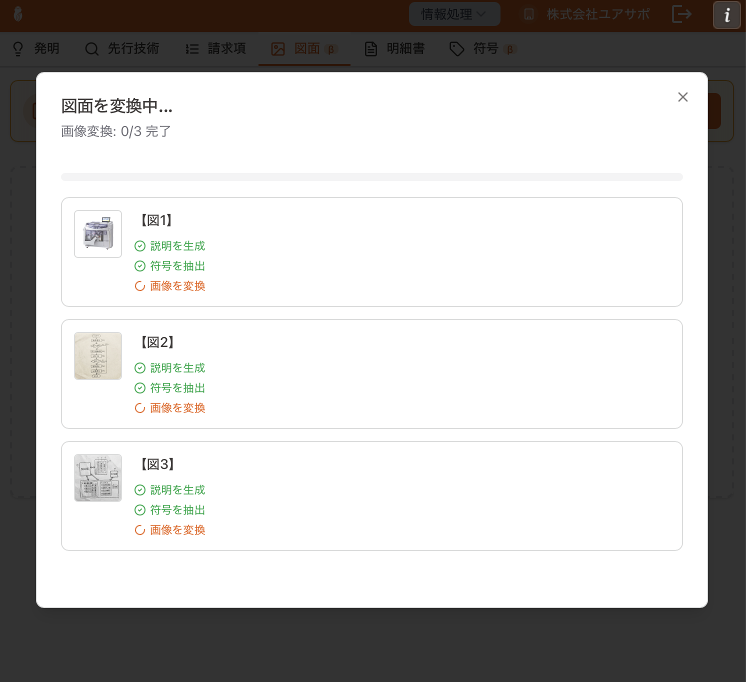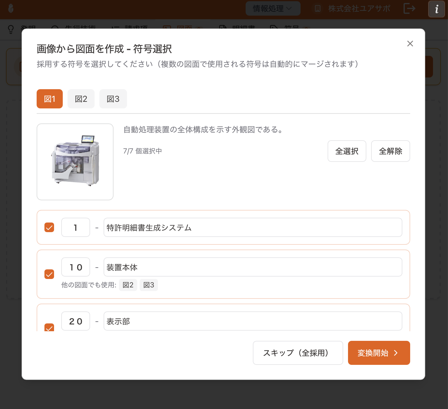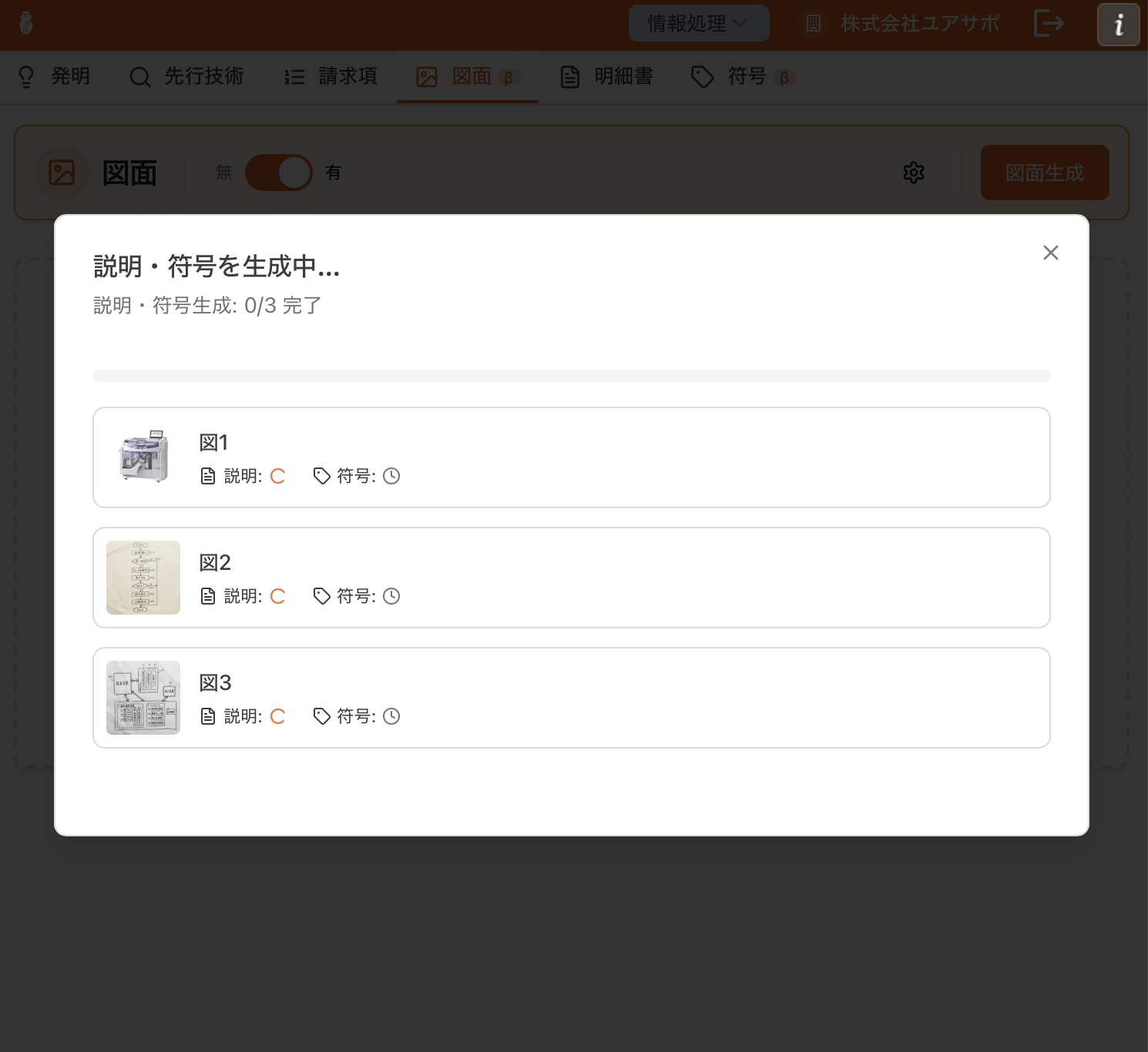 - 説明生成: 請求項や類似特許の情報を参考に、「○○を示す△△図である。」形式の説明文を生成