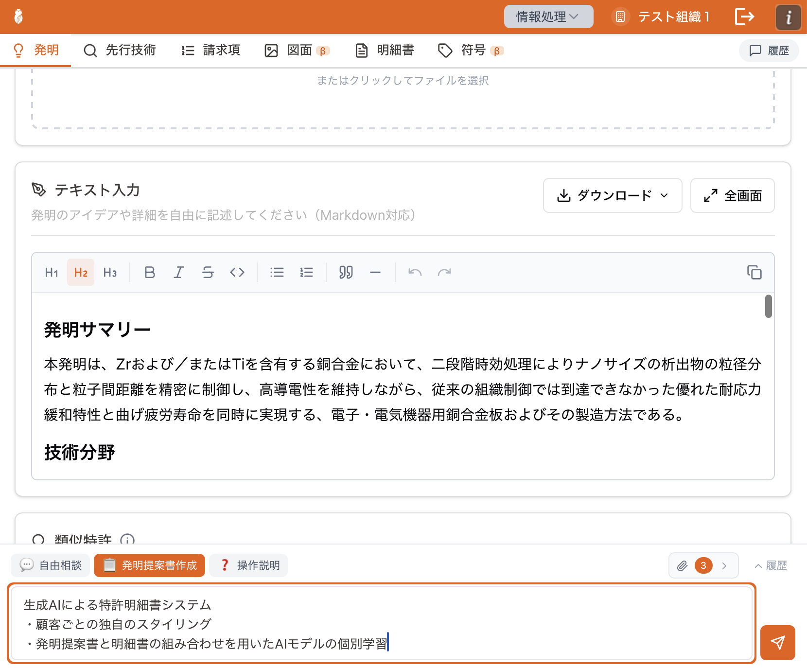 AIが入力内容を解析し、発明提案書を生成します。生成された内容は自動的にテキスト入力エリアに追加されます。