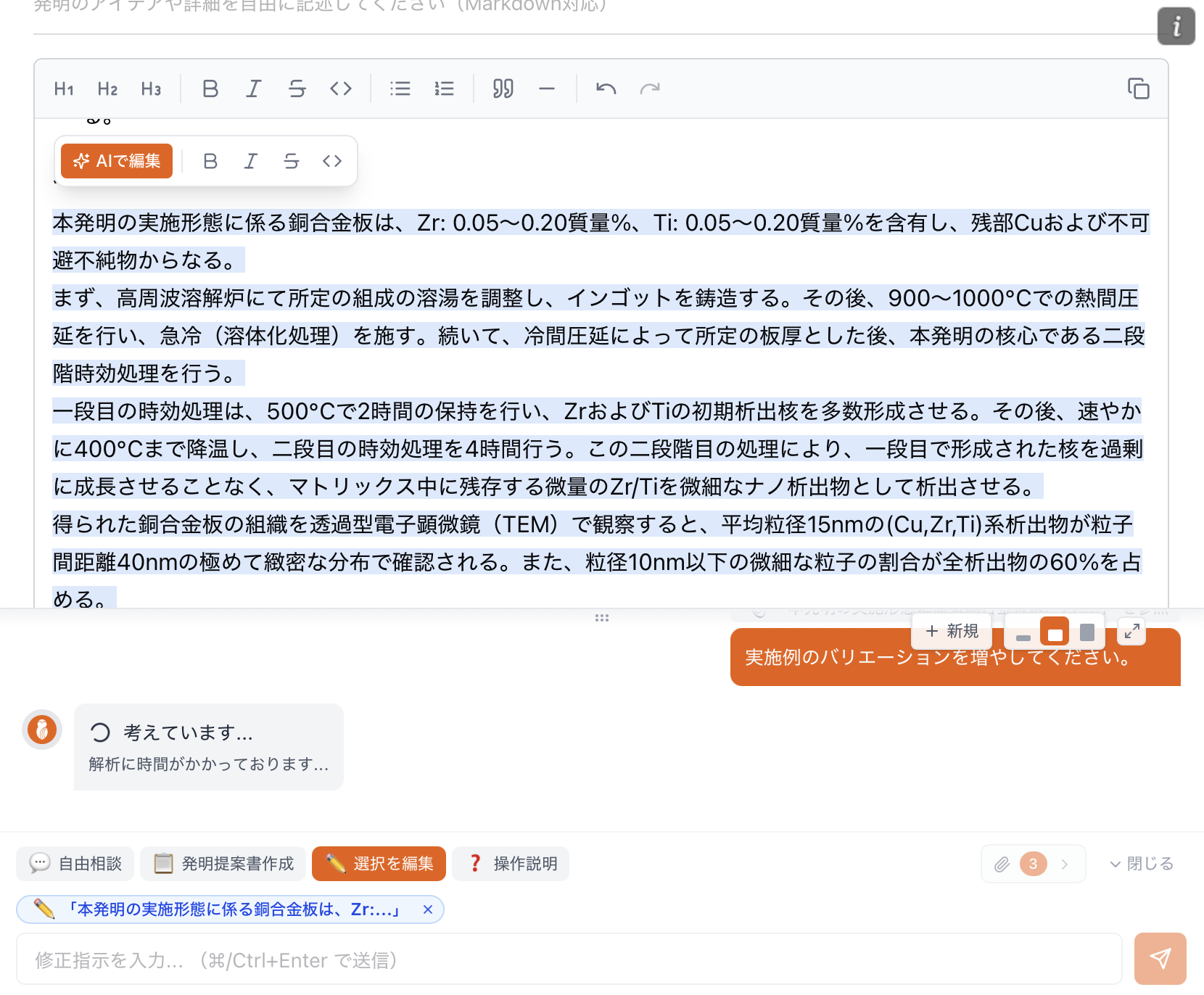 AIチャットでは、会話のコンテキストが保持されます。追加の質問や修正依頼をすることで、発明提案書をさらに充実させることができます。テキスト選択によるAI編集