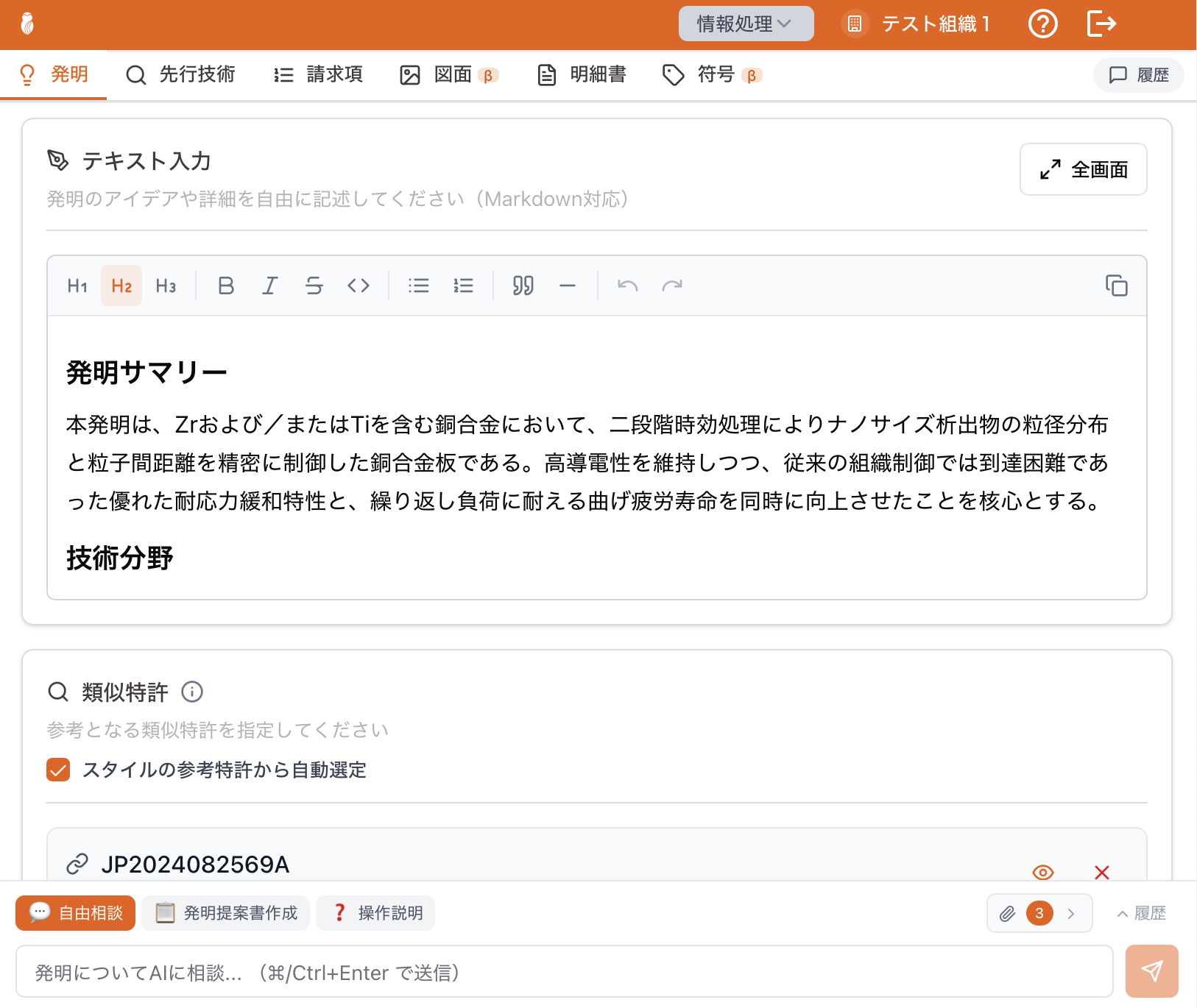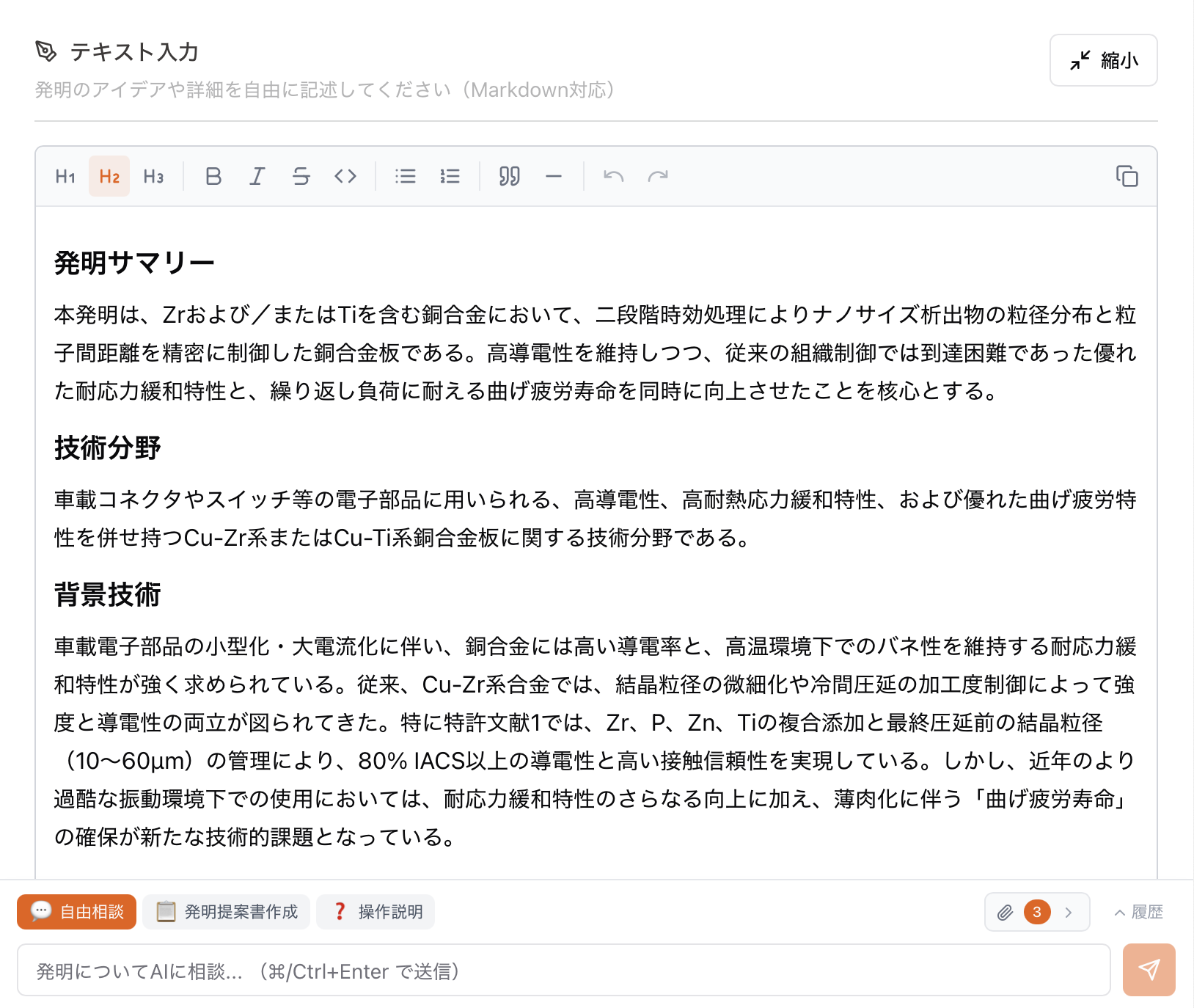 テキスト入力エリアでは、発明に関する情報を自由形式で記述できます。入力した内容は、AIが明細書を生成する際の参考情報として使用されます。