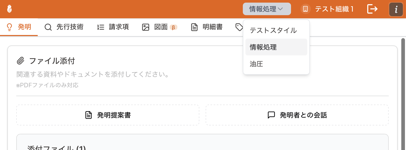スタイル選択機能では、AI生成時に適用する組織固有の文体スタイルを選択できます。組織ごとに登録されたスタイルを選択することで、生成される請求項・明細書の文体を統一できます。